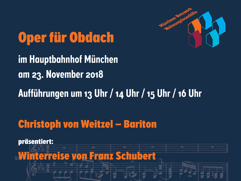 Am 23. November 2018 veranstaltet das Münchner Netzwerk Wohnungslosenhilfe im Zwischengeschoss des Münchner Hauptbahnhofes beim Abgang zur S-Bahn die Oper für Obdach. Um 13 Uhr, 14 Uhr, 15 Uhr und 16 Uhr interpretiert der bekannte Bariton Christoph von Weitzel Franz Schuberts „Winterreise“. Unterstützt wird die Veranstaltung von der Deutschen Bahn Stiftung und Musik ins Leben e.V. Der Eintritt ist frei.